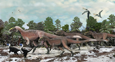 Reconstitution de Yutyrannus huali (qui sont ici les grand dinosaures au plumage brunâtre) dans un